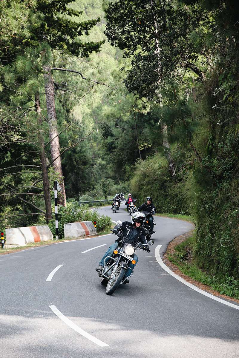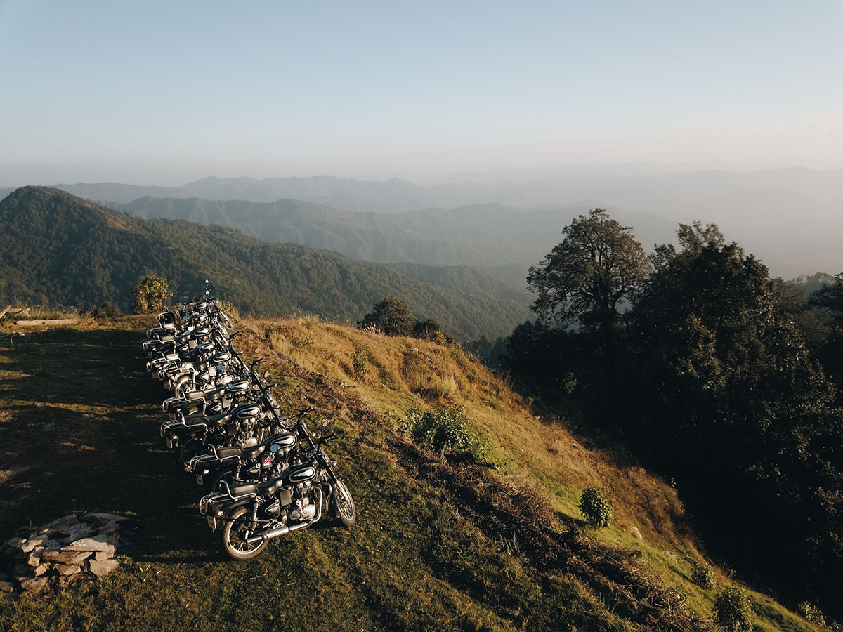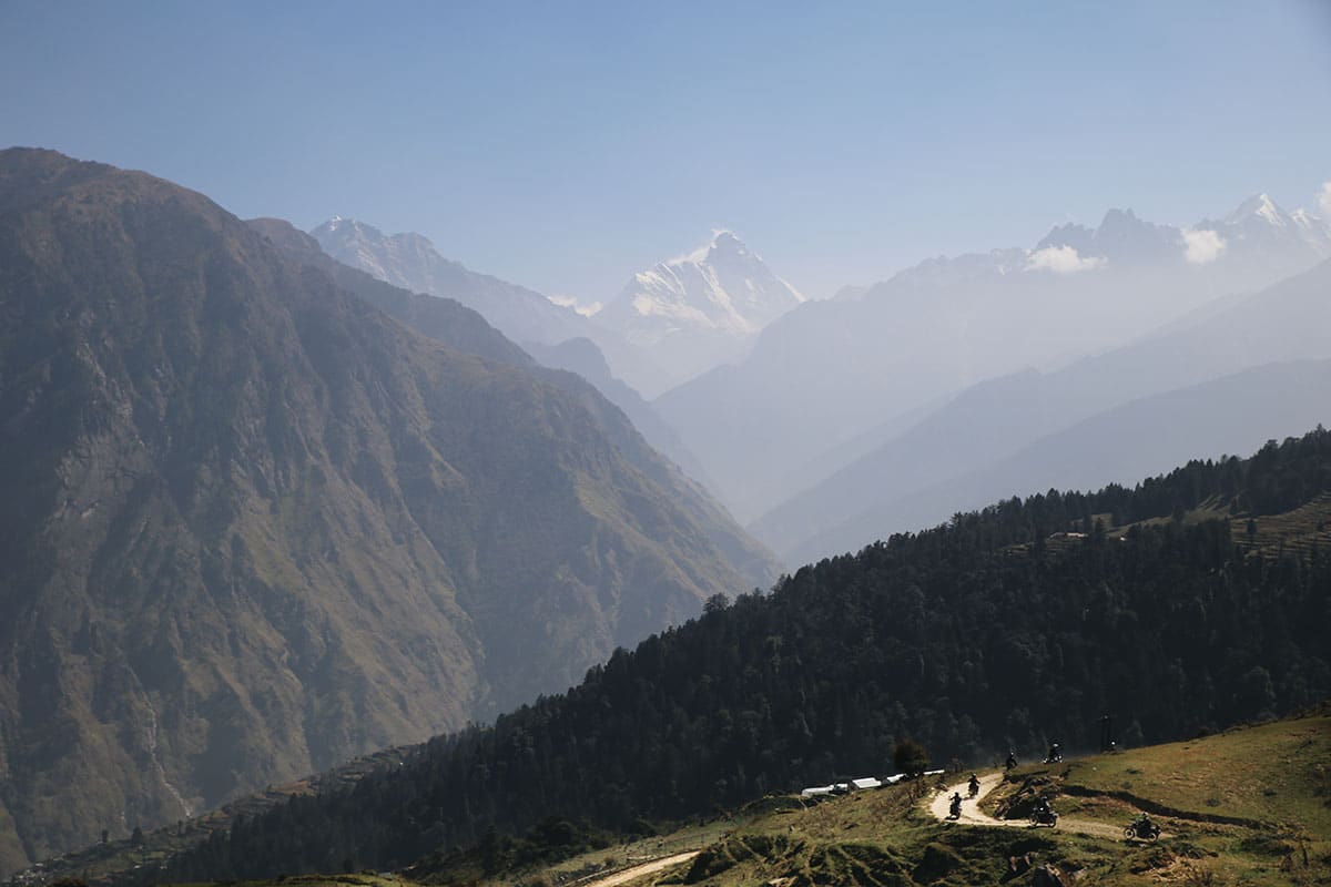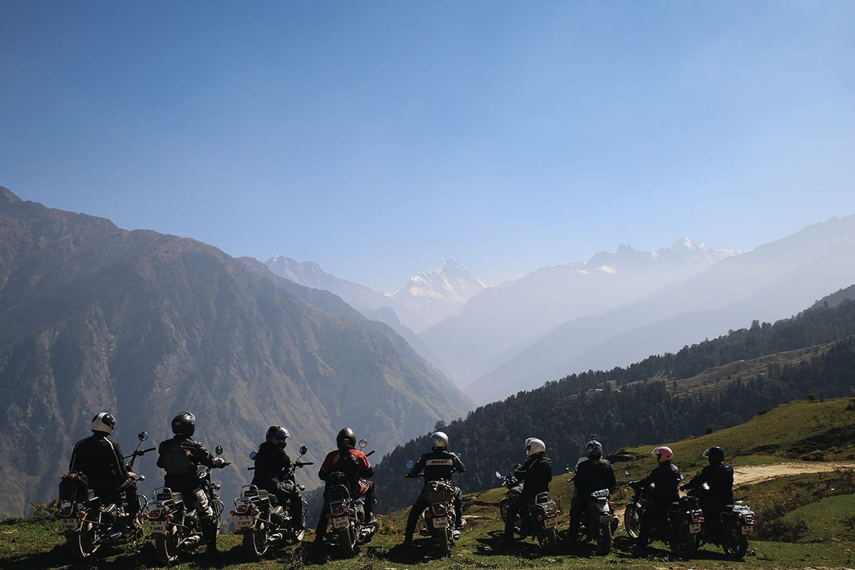 Uttarakhand ligger i Himalaya, högt upp mot Nepal och Tibet. Här är det sol och värme och en fantastisk utsikt mot snöklädda bergstoppar på 7-8000 m. Det är en njutning att köra motorcykel här. Från sadeln ser vi vita bergstoppar, gröna trappkullar, brusande floder och en enorm blomsterprakt. Från frisk bergsluft över bergstopparna kör vi genom små, mysiga landsbygder där det luktar mat, kogödsel och rökelse. Vinkande skolbarn möter oss på flera platser där vi kör och de ler från öra till öra. Vänligheten och värmen från indier känner vi av från vart vi än är.